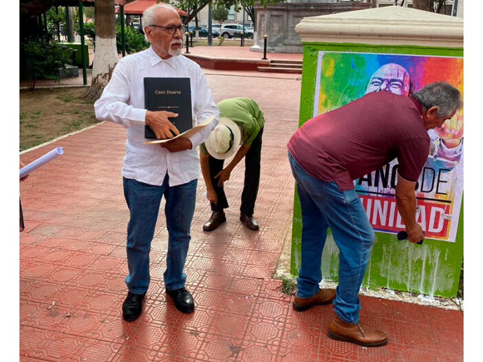 Con una manifestación en la Plaza Hidalgo, situada frente al Palacio de Gobierno, García Chávez exigió que se reabra el proceso para llevar a juicio a Duarte Jáquez por el presunto desvío de 65 millones de pesos del erario hacia la caja de ahorro Unión Progreso, con sede en Ciudad Delicias.
