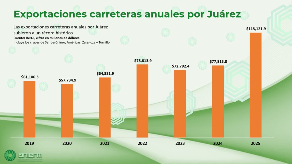 En 2025, las exportaciones por los cruces fronterizos de Ciudad Juárez ascendieron a 113 mil 121.9 millones de dólares, lo que significó un incremento del 45 por ciento respecto al año anterior, cuando el indicador registró una cifra de 77 mil 813.8 millones de dólares, de acuerdo con el reporte más reciente del Instituto Nacional de Estadística y Geografía (Inegi).