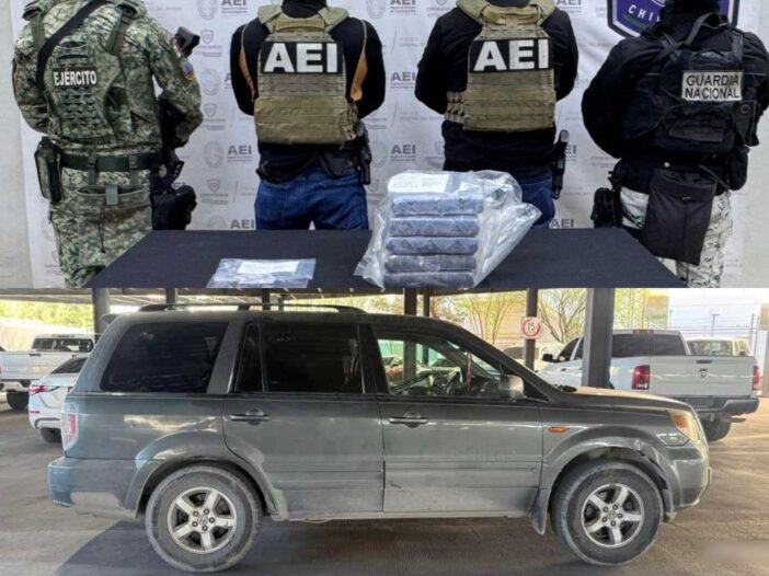 La droga estaba en el interior de una camioneta de la marca Honda Pilot, modelo 2008, color gris, con matrículas de circulación del estado de Chihuahua, el cual quedó asegurado para investigación, se indicó.