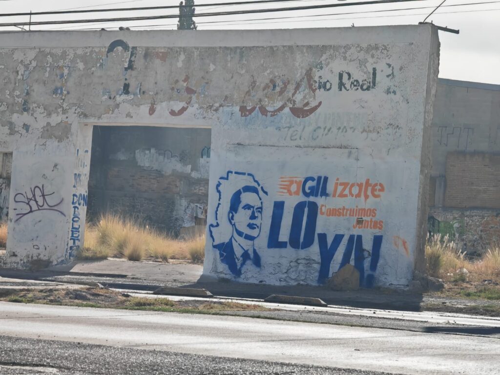 La pinta consiste en un mapa del estado de Chihuahua en color azul, con el dibujo de tres cuartos de una persona que parece Gilberto Loya y el letrero “A-Gil-ízate”, en colores azul y naranja, y más abajo, en letras mayúsculas, un “LO-YA” en azul.