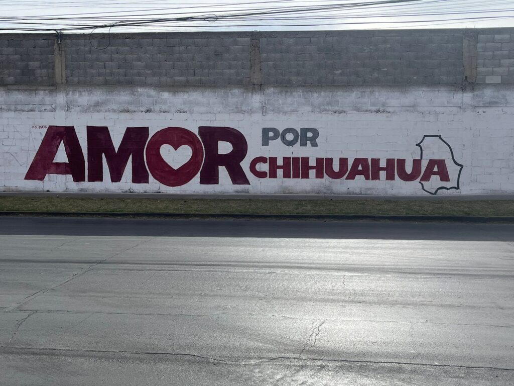 En las bardas del mismo edificio, aunque ya por el lado de Las Industrias, se aprecian las pintas “Amor por Chihuahua”, en colores guinda y rosa sobre fondo blanco, que se han atribuido a promotores de la candidatura de la secretaria de Bienestar federal, Ariadna Montiel Reyes, identificada por el acrónimo “AMOR”.