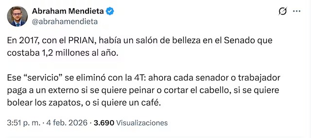 Ese ‘servicio’ se eliminó con la 4T: ahora cada senador o trabajador paga a un externo si se quiere peinar o cortar el cabello, si se quiere bolear los zapatos, o si quiere un café”, publicó.
