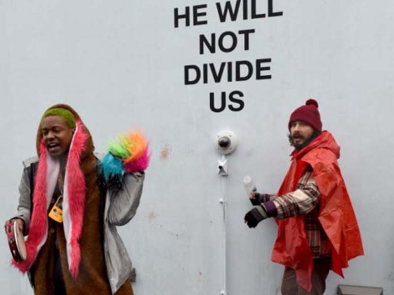 El actor y otros dos artistas instalaron el proyecto, que incluye una cámara en un muro con el mensaje en mayúsculas "Él no nos dividirá"