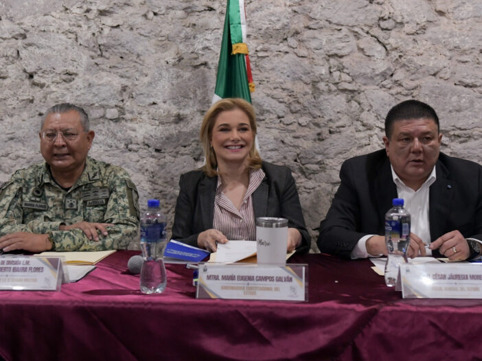 La gobernadora María Eugenia Campos Galván encabezó este martes una sesión de la Mesa Estatal de Construcción de Paz en el municipio de Guadalupe y Calvo, donde autoridades de los tres órdenes de gobierno acordaron reforzar la presencia de las corporaciones de seguridad y coordinar acciones para restablecer la tranquilidad en la región.