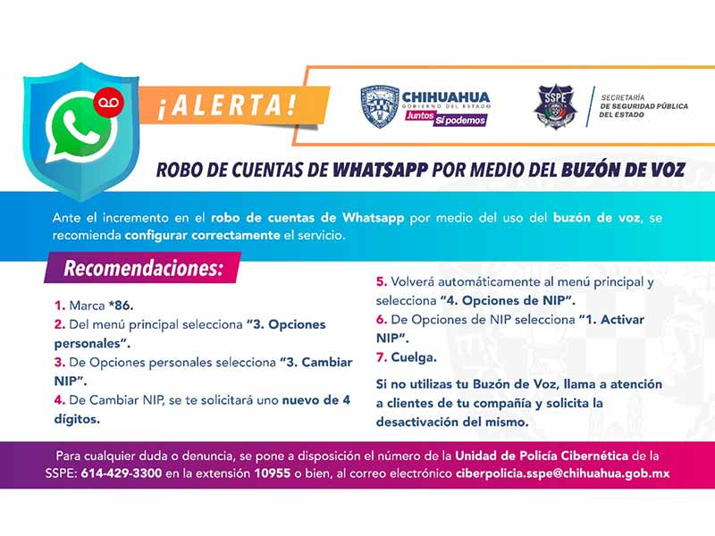 La Policía Cibernética de la Secretaría de Seguridad Pública Estatal (SSPE) emitió un comunicado para alertar a las personas usuarias de WhatsApp sobre el robo de cuentas mediante buzón de voz.