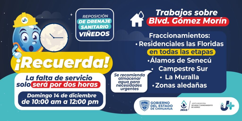 Para continuar con los trabajos de reposición del colector Viñedos sobre el bulevar Manuel Gómez Morín, el suministro de agua en zonas aledañas será suspendido de las 10 a las 12 horas del próximo domingo, 14 de diciembre, informó personal de la Junta Municipal de Agua y Saneamiento (JMAS).