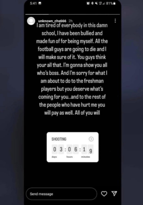 En el supuesto mensaje quien lo escribe se dice cansado de ser víctima de acoso escolar solo por ser él mismo; por esa razón lanzó una amenaza directa de muerte contra los estudiantes que forman parte del equipo de futbol de la escuela.