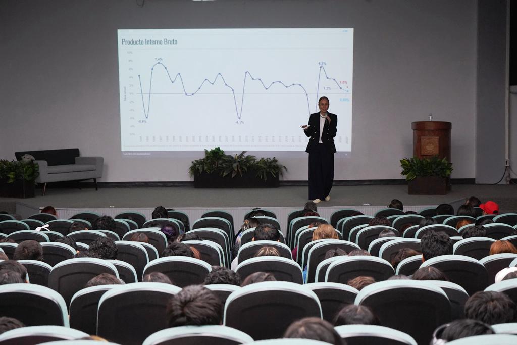 La expositora fue la maestra Valeria Moy, economista y directora general del Instituto Mexicano para la Competitividad (IMCO), quien destacó ante la comunidad universitaria la importancia de comprender la economía, tanto en su dimensión micro, como macroeconómica.