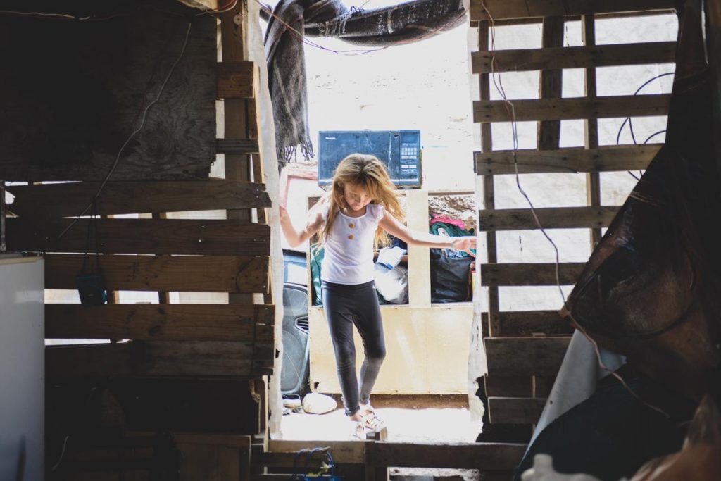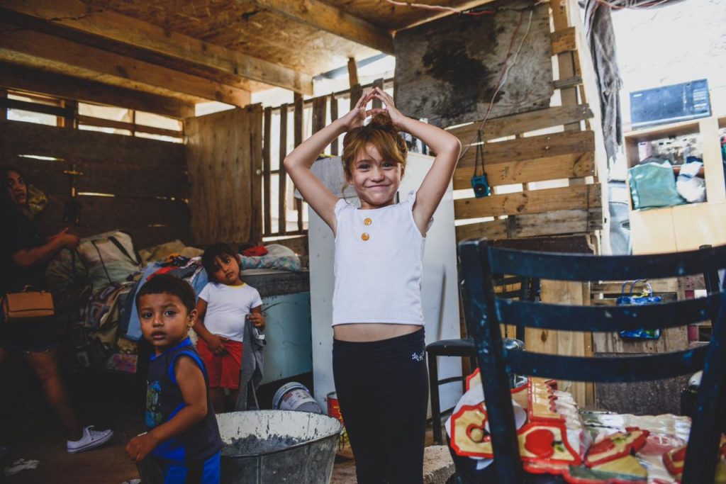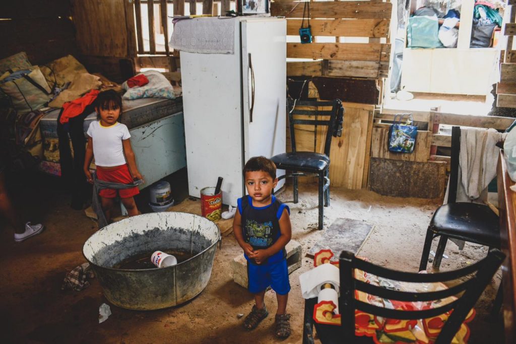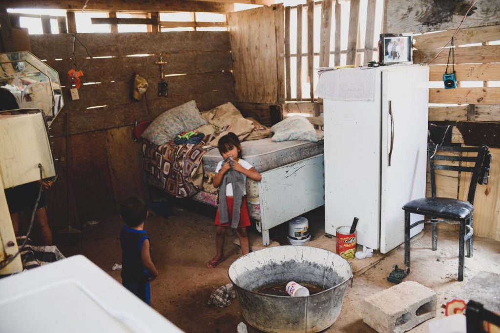 En su interior, un bebé rueda en la cama, pegada a una de las paredes, en donde pende un crucifijo, mientras que dos niñas y otro infante de cuatro años, no paran de moverse en el espacio reducido del cuarto, sin piso firme, a ras de tierra. Son sus cuatro nietos.