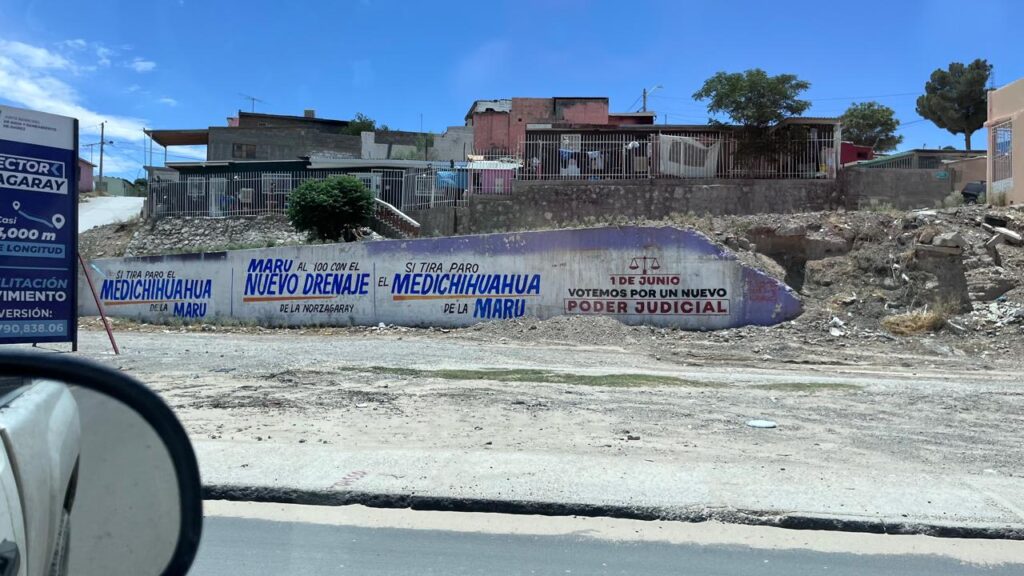 Diversas leyendas en letras azules, sin logotipos del PAN, fueron ubicadas desde la semana pasada en bardas de Anapra y Riberas del Bravo, dos de los desarrollos habitacionales más deprimidos de la frontera.