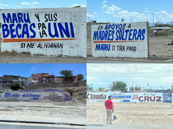 Algunas de las leyendas escritas son: “Maru y sus becas pa’ la uni, sí me alivianan”; “En apoyo a madres solteras, Maru si tira paro”; “Si tira paro el MediChihuahua de Maru”; y “Maru, al cien con el nuevo drenaje del Norzagaray”.