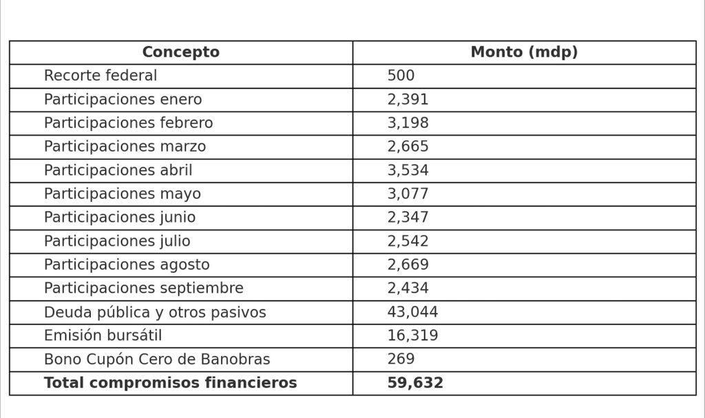 En total, los compromisos financieros del Gobierno del Estado representan cerca de 60 mil millones de pesos, de acuerdo con los documentos oficiales consultados.