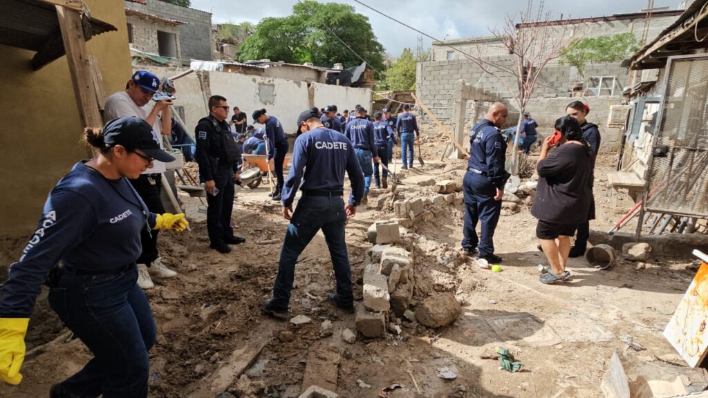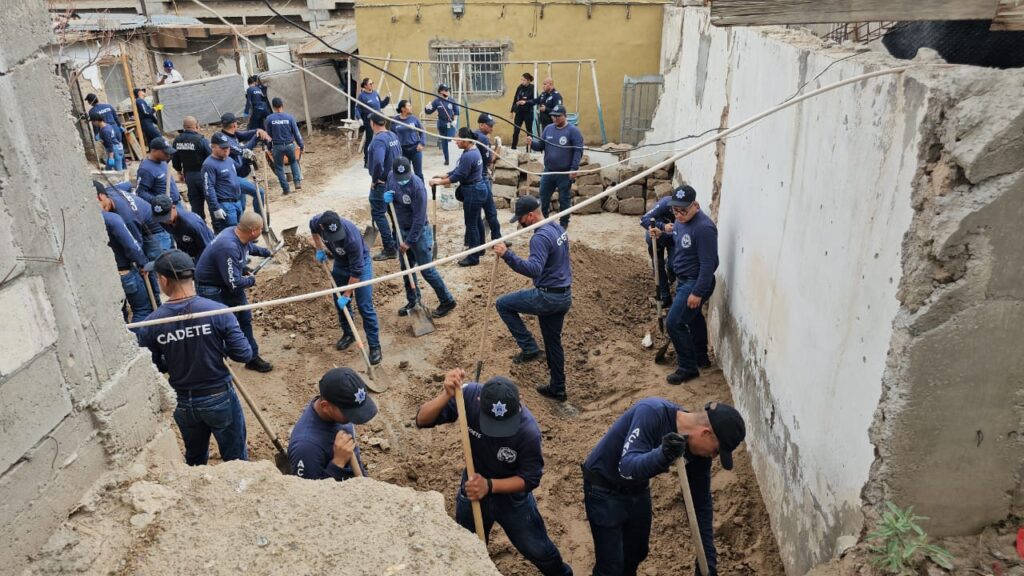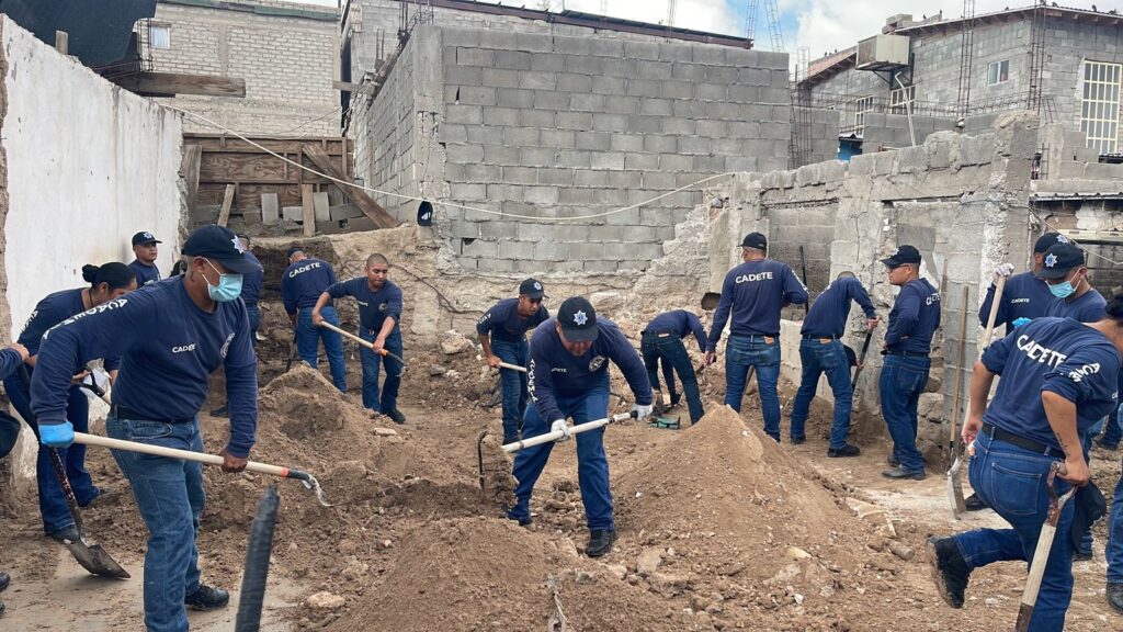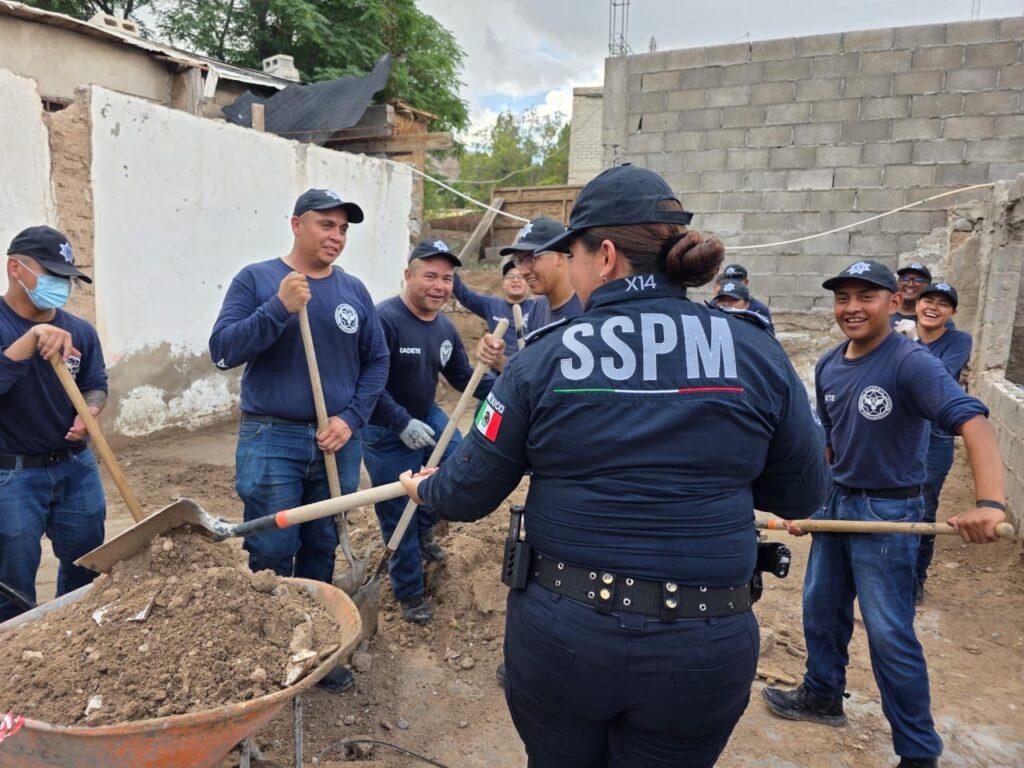 Armados con palas, medio centenar de cadetes llegaron desde temprana hora a la colonia Francisco Sarabia donde fueron instruidos por el Secretario de Seguridad Pública Municipal, César Omar Muñoz Morales, para atender a varias familias que perdieron prácticamente todo.