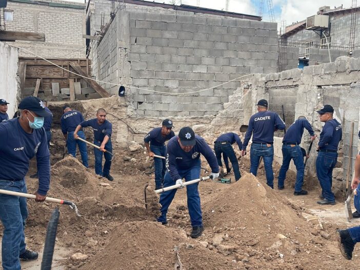 Armados con palas, medio centenar de cadetes llegaron desde temprana hora a la colonia Francisco Sarabia donde fueron instruidos por el Secretario de Seguridad Pública Municipal, César Omar Muñoz Morales, para atender a varias familias que perdieron prácticamente todo.