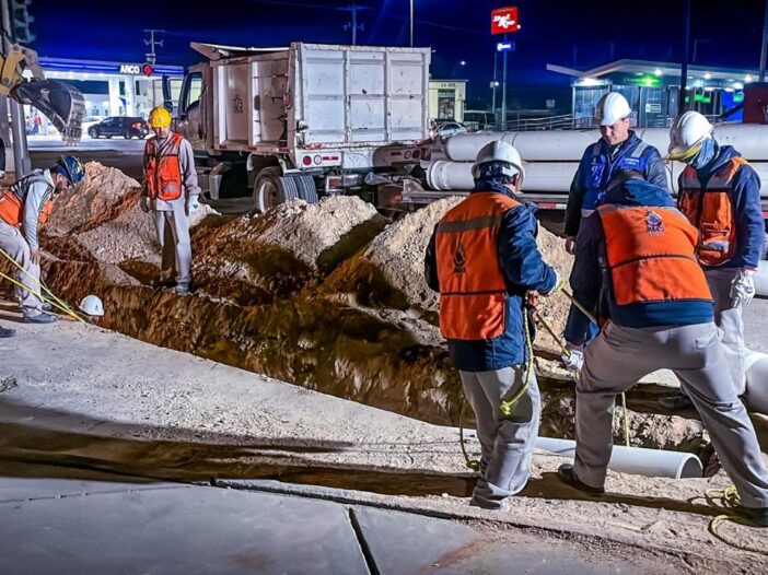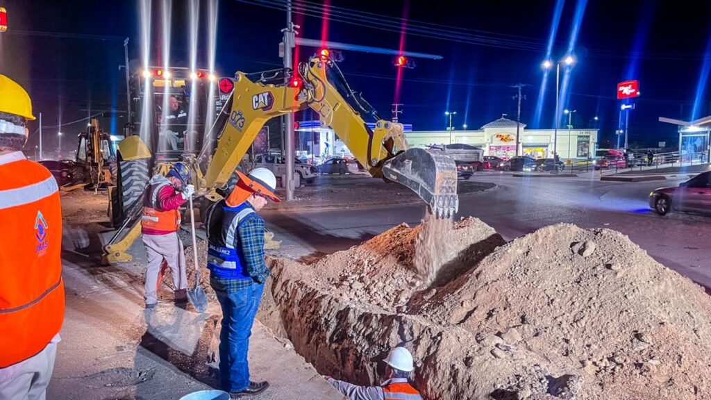 En medio de las labores que llevan a cabo trabajadores de la Junta Municipal de Agua y Saneamiento (JMAS) de Juárez en el proyecto de sectorización del servicio de agua potable, durante la noche de ayer y la madrugada de este día se realizó la instalación de tubería nueva de 12 pulgadas en el fraccionamiento Parajes de Oriente.