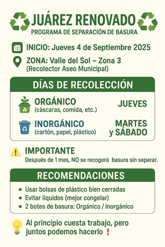 A partir del 7 de septiembre, los habitantes de un sector de Ciudad Juárez deberán separar su basura en dos categorías: orgánica e inorgánica. El nuevo esquema de recolección inicia en la zona de Valle del Sol y se extenderá gradualmente a todo el municipio.
