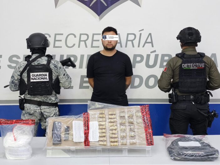 Personal del Grupo Especial de Detectives de la Secretaría de Seguridad Pública del Estado (SSPE), llevó a cabo la detención Miguel Ángel CA de 24 años, quien portaba consigo supuesta droga y cartuchos útiles.