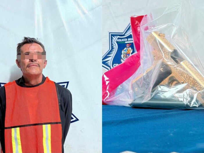 Por tal motivo fue abordado y al realizarle una inspección preventiva por protocolos de seguridad, se le localizó en medio de los asientos un arma de fuego en color dorado, con un cargador desabastecido, por lo que procedieron con la detención del hombre, agrega el comunicado.