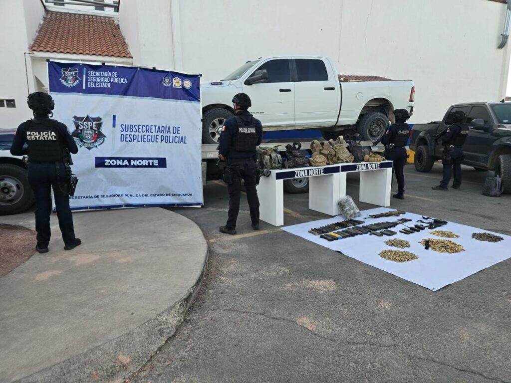 Durante la mañana de este jueves, la Secretaría de Seguridad Pública del Estado (SSPE) informó que como parte de un operativo realizado en el Valle de Juárez, aseguraron tres camionetas con reporte de robo, en las que se encontraron diversas armas de fuego, mil 100 cartuchos útiles, una granada y equipo táctico, cinco como chalecos antibalas.