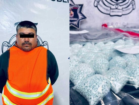 Elementos de la Secretaría de Seguridad Pública Municipal adscritos en la Estación de Policía del Distrito Poniente, incautaron 43.5 kilogramos de cristal y 50 mil pastillas de fentanilo, además de arrestar a dos personas, hechos ocurridos en la colonia Toribio Ortega.