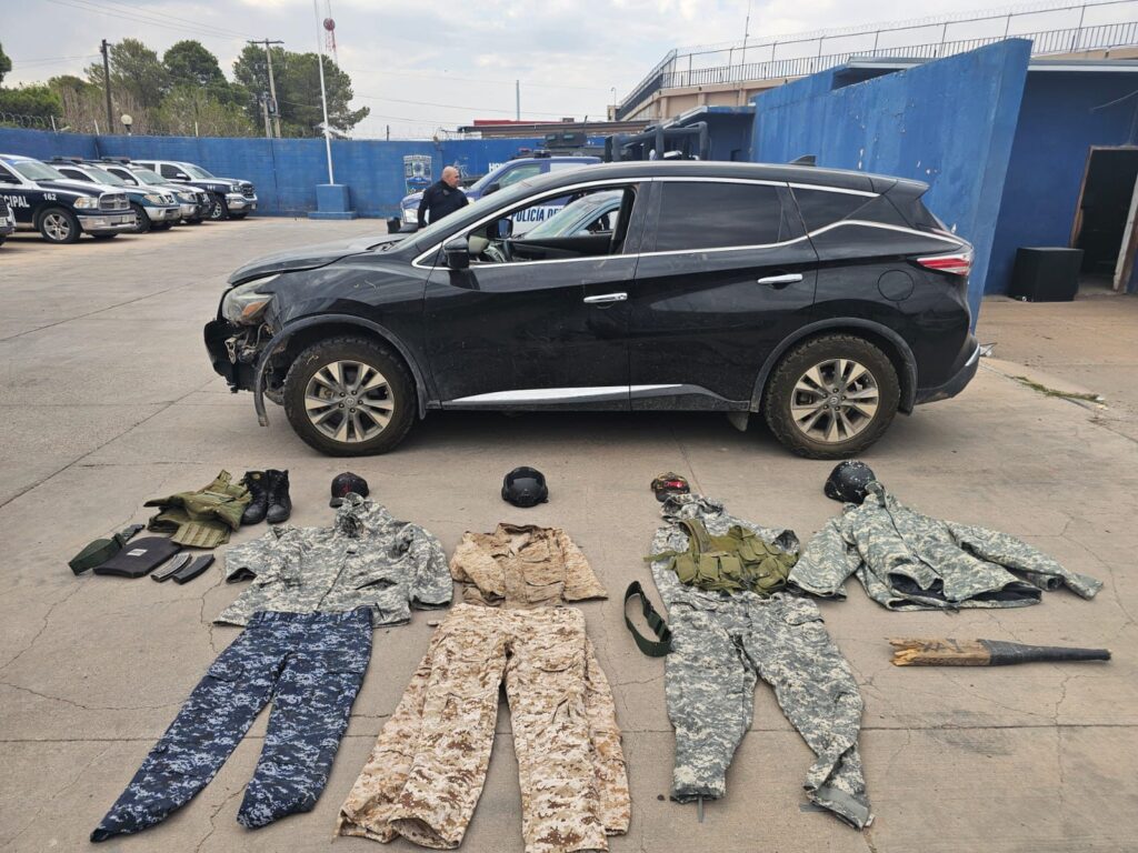 En un primer operativo en el poblado de Mata Ortiz, se recuperó un Nissan Murano modelo 2018 con placas sobrepuestas y reporte de robo en San Marcos, Texas. Dentro del vehículo, se encontraron una maleta y una mochila que contenían diverso equipo táctico. La maleta albergaba seis camisolas tácticas y seis pantalones camuflados de diferentes colores. La mochila contenía tres cascos, tres gorras, tres placas balísticas, una pechera verde, un chaleco porta placas verde, dos cintos tácticos verdes, un par de botas tácticas negras y dos mallas kevlar.