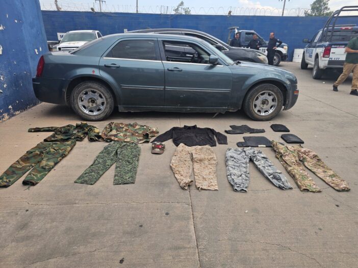 En un primer operativo en el poblado de Mata Ortiz, se recuperó un Nissan Murano modelo 2018 con placas sobrepuestas y reporte de robo en San Marcos, Texas. Dentro del vehículo, se encontraron una maleta y una mochila que contenían diverso equipo táctico. La maleta albergaba seis camisolas tácticas y seis pantalones camuflados de diferentes colores. La mochila contenía tres cascos, tres gorras, tres placas balísticas, una pechera verde, un chaleco porta placas verde, dos cintos tácticos verdes, un par de botas tácticas negras y dos mallas kevlar.