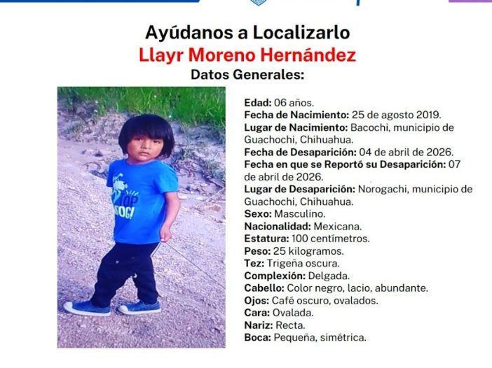 Autoridades mantienen un operativo de búsqueda para localizar al niño Llayr Moreno Hernández, de seis años de edad, quien fue reportado como ausente desde el pasado 7 de abril en la localidad de Norogachi, municipio de Guachochi.
