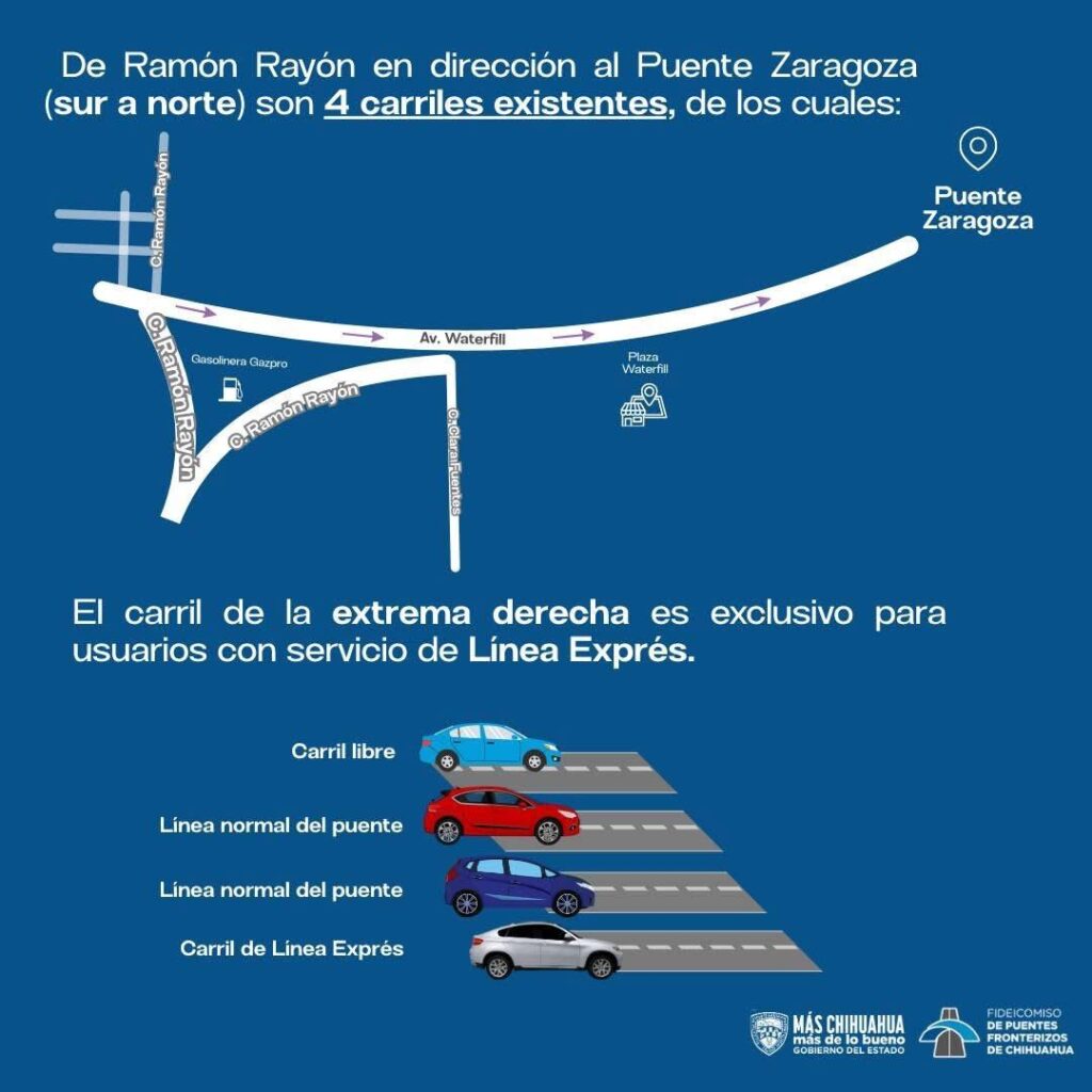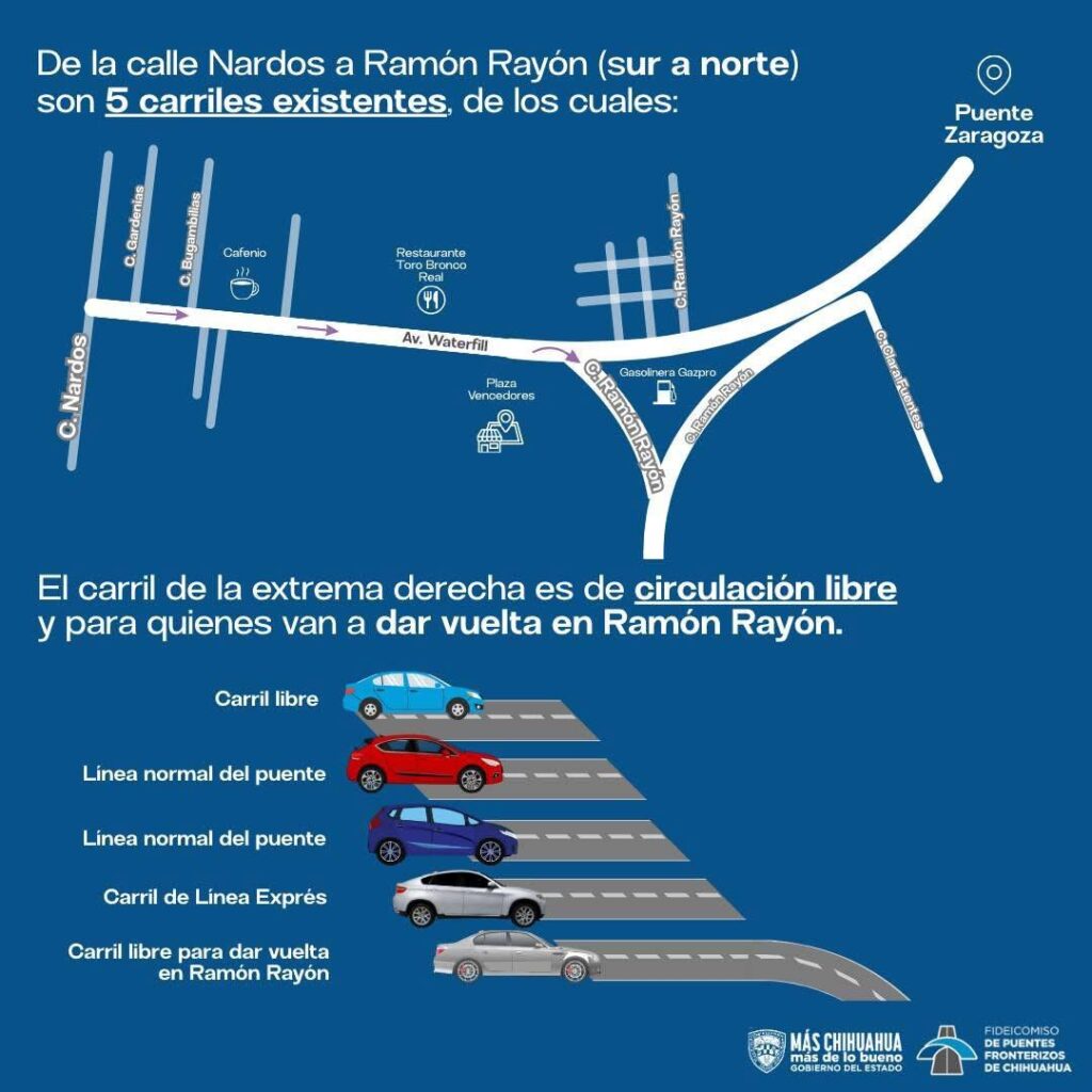 Autoridades del Fideicomiso de Puentes Fronterizos de Chihuahua (Fpfch) dieron a conocer la función de cada uno de los carriles de la avenida Waterfill para llegar hasta el puente de Zaragoza y solicitó a los conductores utilizarlos como se especifica para evitar situaciones viales de conflicto.