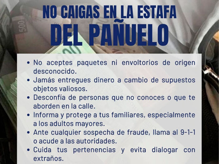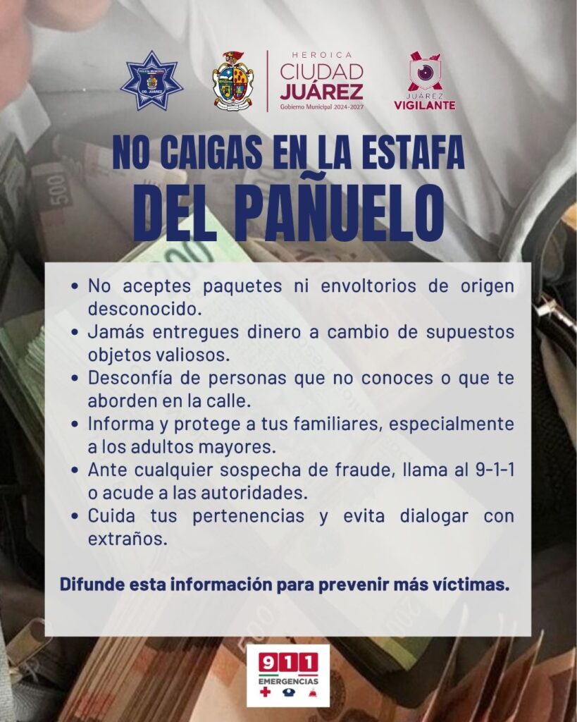 De acuerdo con la Dirección de Seguridad Pública Municipal, el fraude conocido como “la estafa del pañuelo” consiste en entregar un paquete o bulto con supuestos billetes o joyas, para luego convencer a la víctima de entregar una cantidad de dinero “a cambio de quedarse con el hallazgo”.