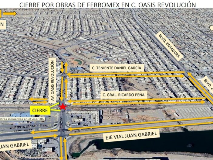 A lo largo de 10 días, a partir del sábado 13 de septiembre, se realizará un cierre parcial sobre la avenida Oasis Revolución, en el tramo comprendido entre el eje vial Juan Gabriel y la calle General Ricardo Peña.