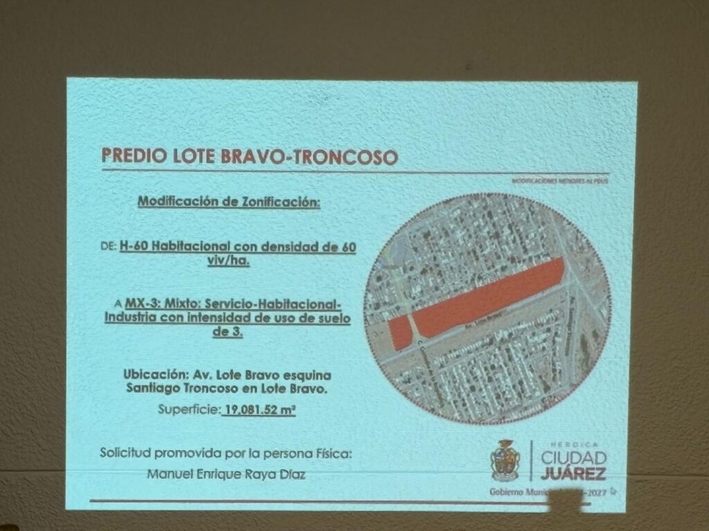 La decisión, que aún debe ser autorizada por el pleno del Ayuntamiento juarense, involucra un predio de 19 mil 81 metros cuadrados, ubicado en el cruce de las avenidas Lote Bravo y Santiago Troncoso, en la zona conocida como Lote Bravo.