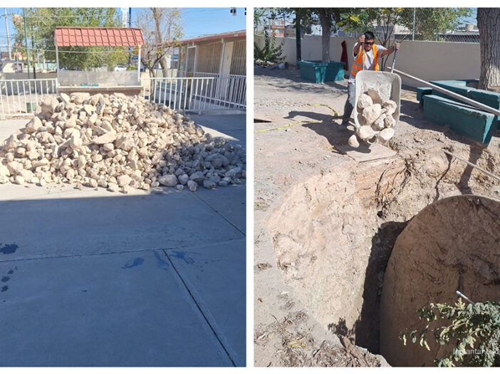 En seguimiento a las labores de reparación de las escuelas afectadas por las lluvias del mes pasado, trabajadores acudieron de nuevo este viernes para sellar el socavón que se formó en la primaria Libertad tras colapsar una fosa séptica en el patio del plantel.