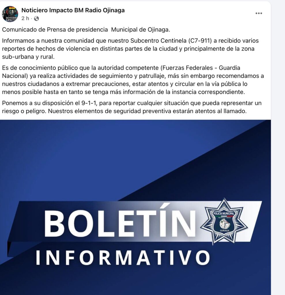 Medios locales como Noticiero Impacto BM Radio Ojinaga difundieron un comunicado de la presidencia municipal en el que se reconoce que el Subcentro Centinela (C7–911) recibió varios reportes de violencia en distintos puntos, principalmente en la zona sub-urbana y rural.