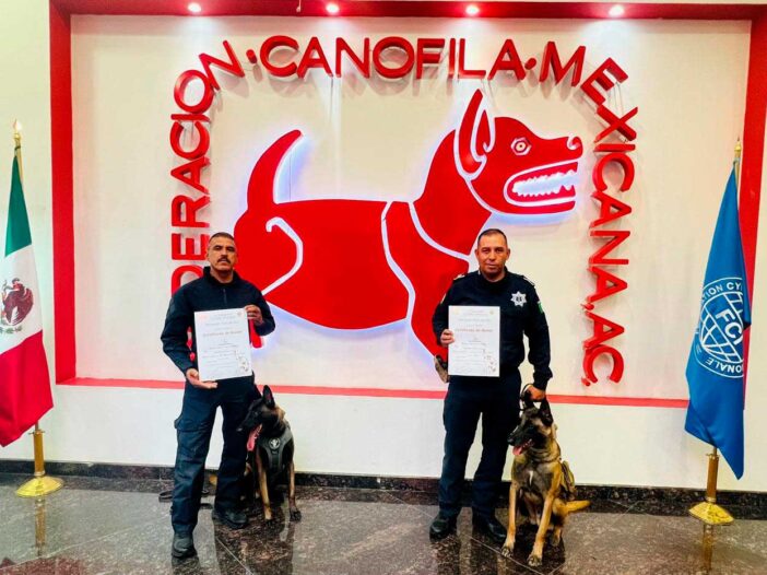 Bruno y Cuate, dos elementos caninos y sus manejadores pertenecientes a la división K9 de la Secretaría de Seguridad Pública Municipal, obtuvieron el reconocimiento en la justa denominada “Mejor perro del año en trabajo y servicio 2023” por parte de la Federación Canófila Mexicana.