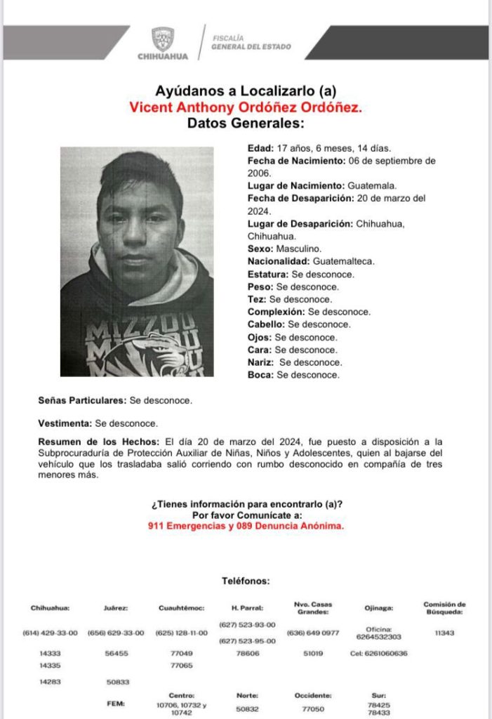 La Fiscalía General del Estado mantiene el reporte de desaparición de 4 jóvenes de Guatemala, quienes desaparecieron en la ciudad de Chihuahua el pasado 20 de marzo.