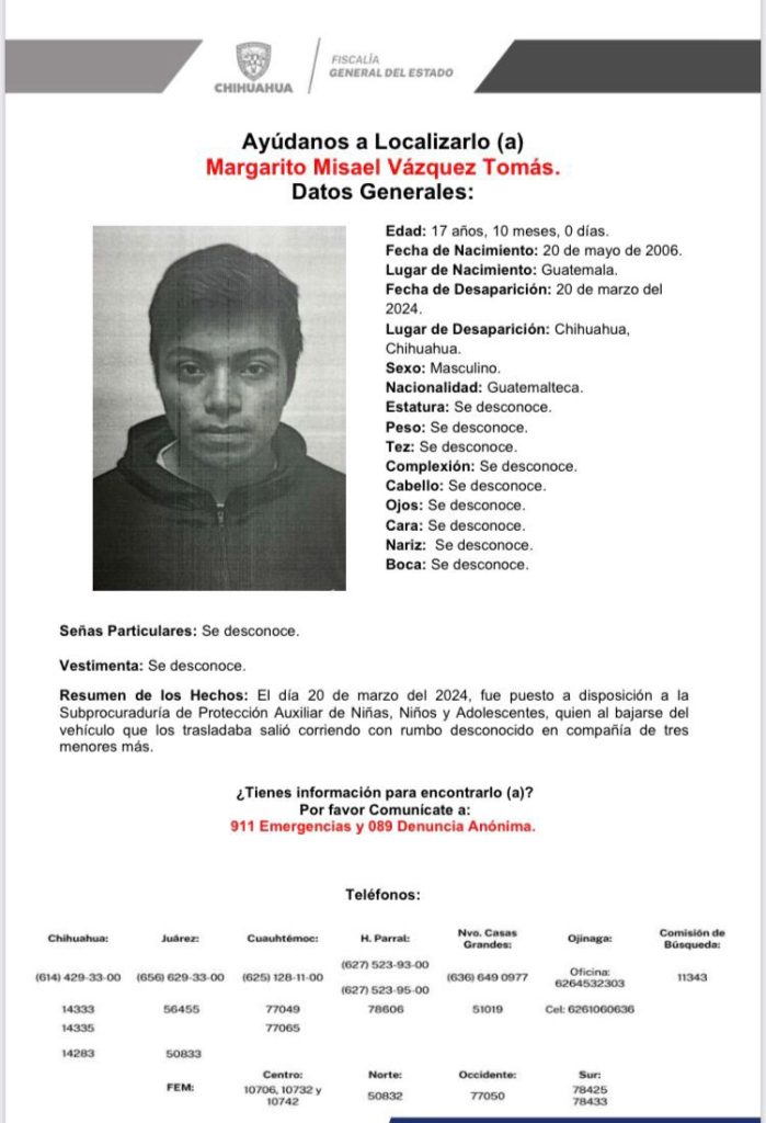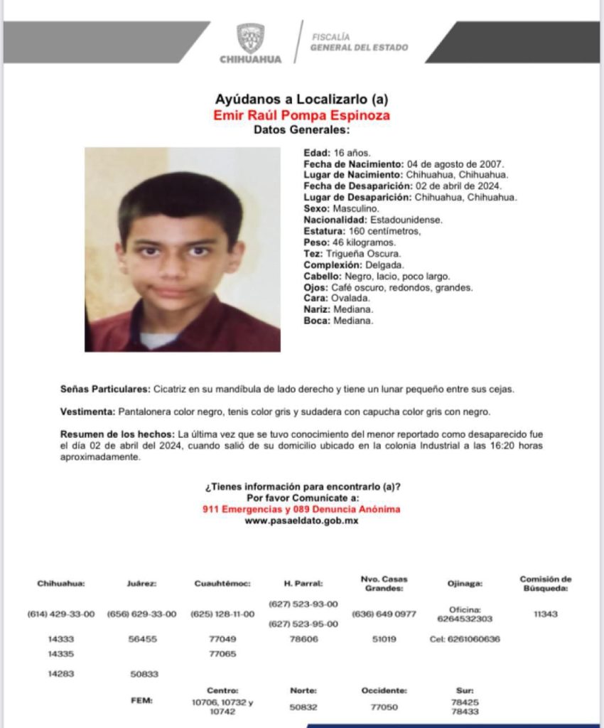 De igual manera, la FGE reporta a Zahira Bianey Rivas de 19 años y Emir Raúl Pompa Espinoza de 16 años, desaparecidos el 31 de marzo y 02 de abril, respectivamente. Ambos son de origen estadounidense y fueron vistos por última vez, en la ciudad de Chihuahua.