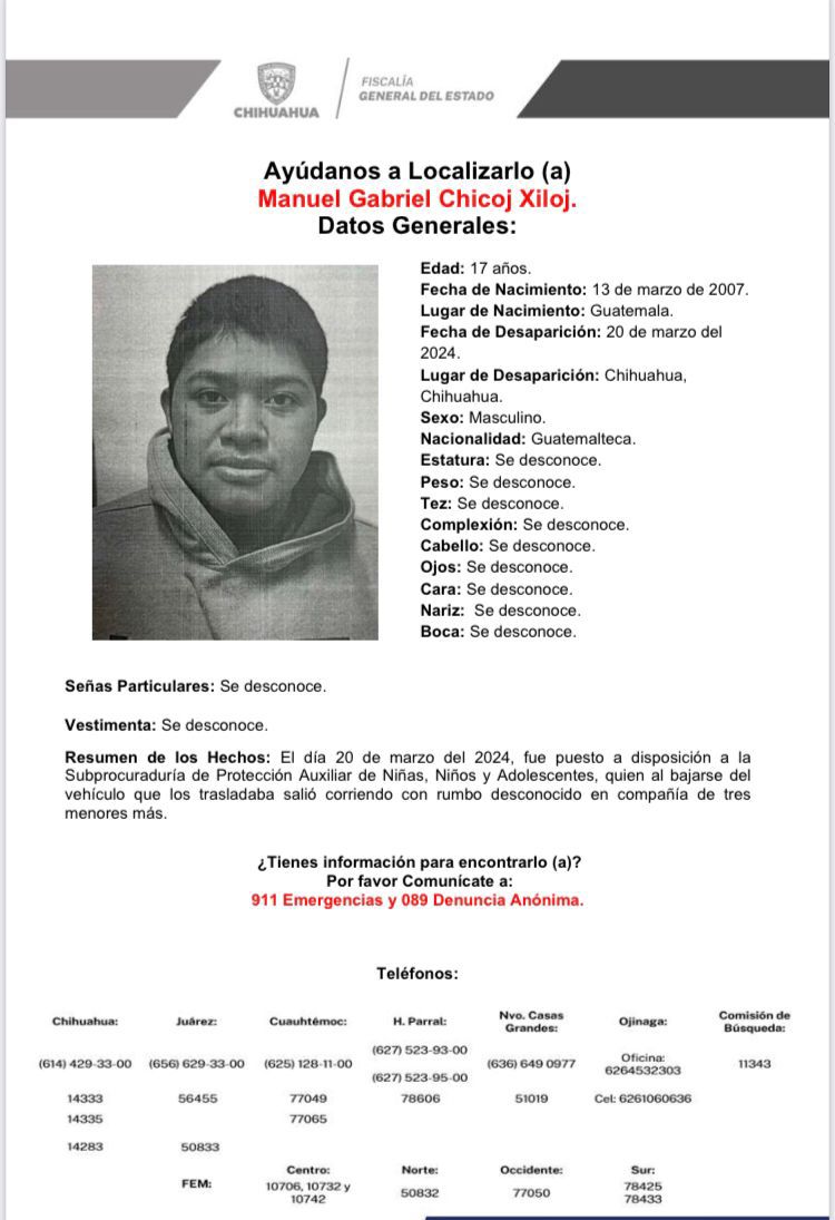 La Fiscalía General del Estado mantiene el reporte de desaparición de 4 jóvenes de Guatemala, quienes desaparecieron en la ciudad de Chihuahua el pasado 20 de marzo.