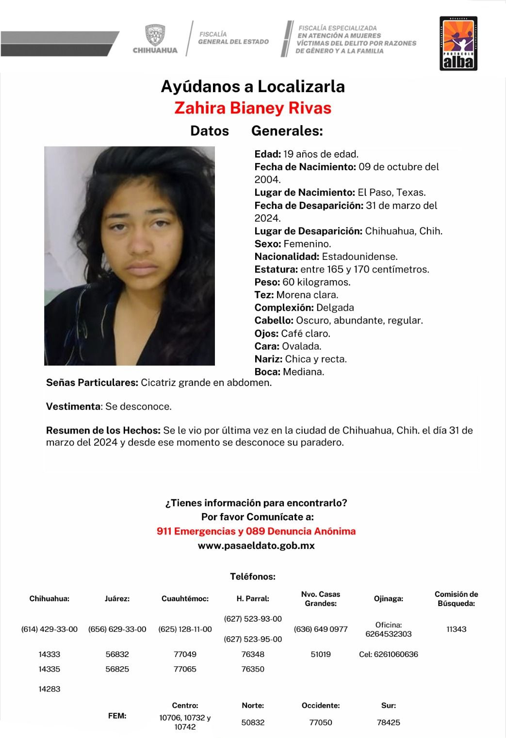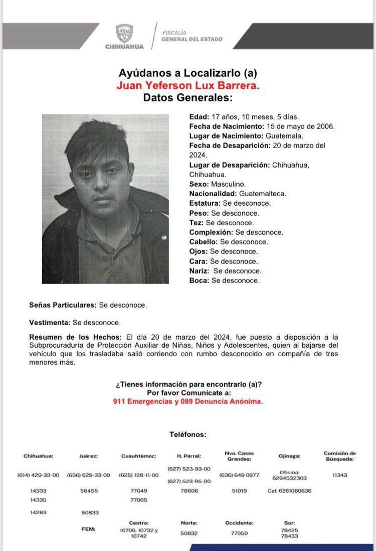 De igual manera, la FGE reporta a Zahira Bianey Rivas de 19 años y Emir Raúl Pompa Espinoza de 16 años, desaparecidos el 31 de marzo y 02 de abril, respectivamente. Ambos son de origen estadounidense y fueron vistos por última vez, en la ciudad de Chihuahua.