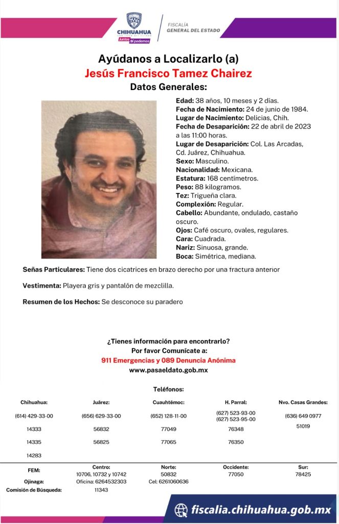 Elementos de la Fiscalía de Distrito Zona Norte, adscritos a la Unidad Especializada De Personas Desaparecidas o No Localizadas Hombres, así como de la Agencia Estatal de Investigación, realizaron ayer sábado 29 de abril, un operativo de rastreo en búsqueda de Jesús Francisco Tamez Chairez, de 38 años de edad, de quien se desconoce su paradero desde el 22 de abril en Ciudad Juárez.