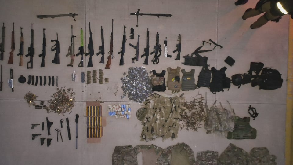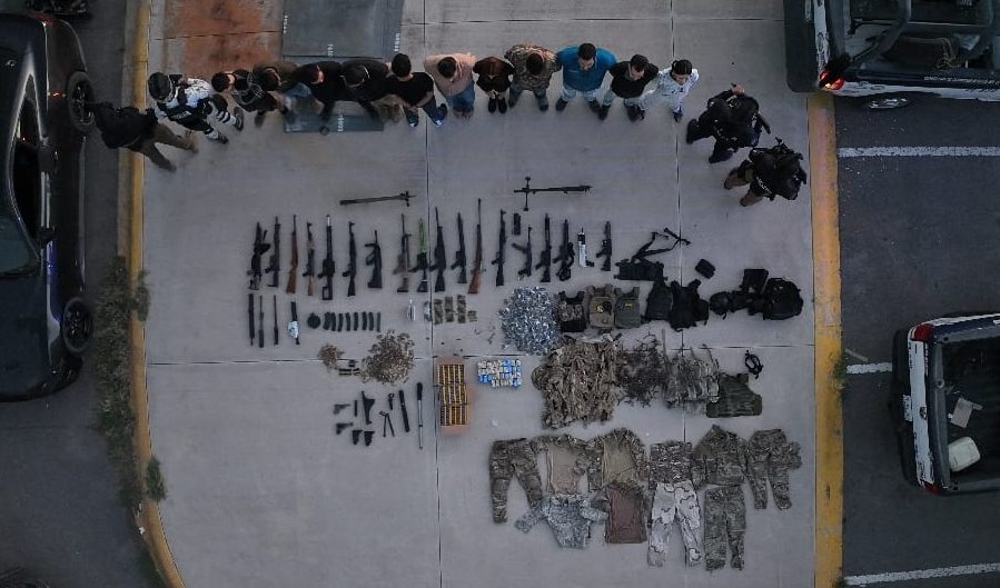 Durante la acción, los agentes aseguraron un arsenal que incluía 21 armas de fuego, en su mayoría fusiles, 12 cargadores, 4 mil 514 cartuchos, 136 ponchallantas, seis chalecos porta placas, un casco y un traje de francotirador camuflado tipo Ghillie, además de diverso equipo táctico.