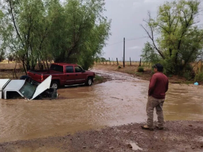 En Nuevo Casas Grandes se presentó de manera intensa, lo que derivó en el desbordamiento de un río, el arrastre de vehículos y un tráiler varado.