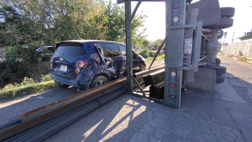 Un camión de carga con material para construcción se volcó y cayó sobre un automóvil estacionado en la avenida Carlos Pellicer, entre la Plutarco Elías Calles y el bulevar Óscar Flores.