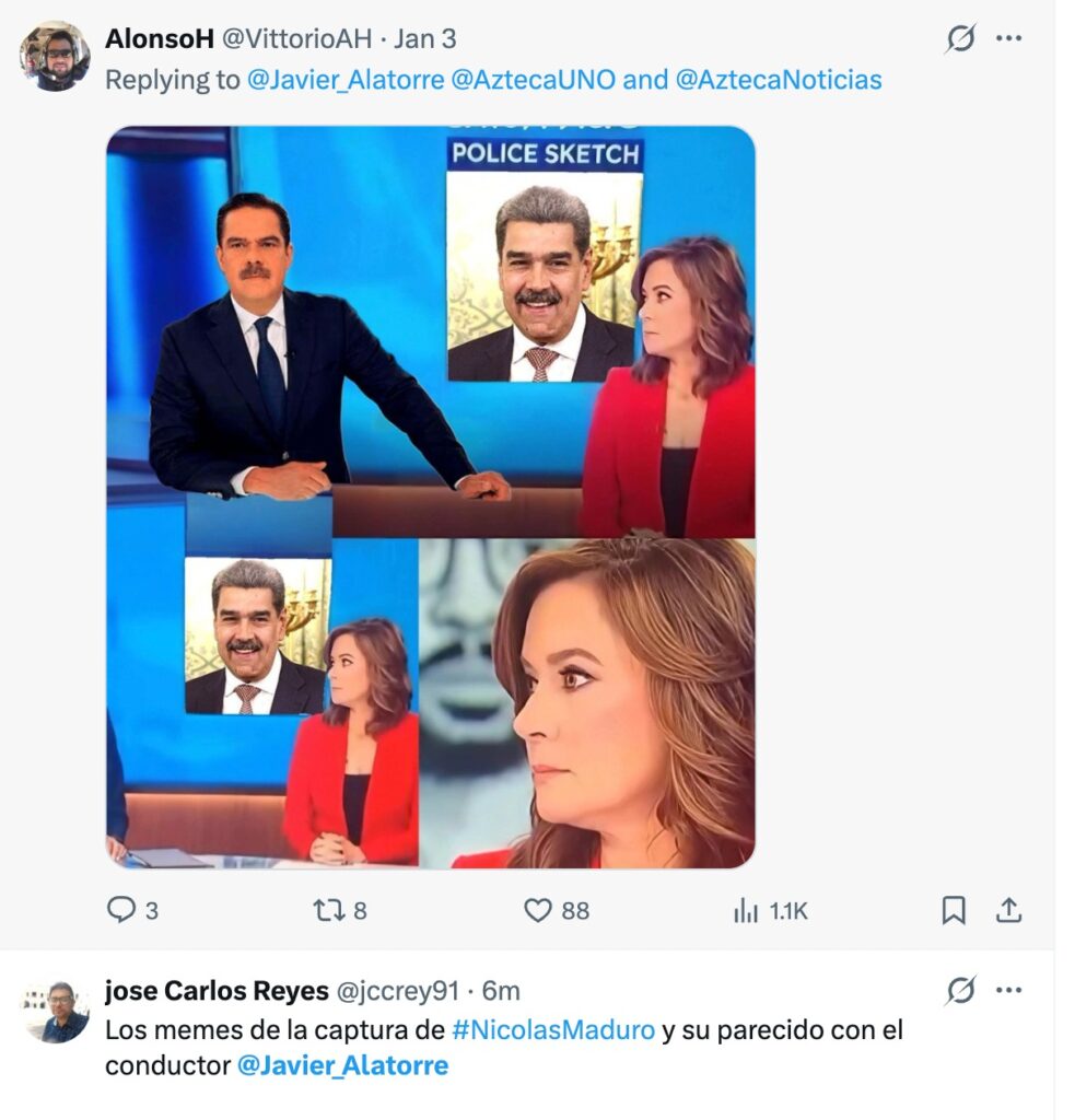Tras la difusión de imágenes oficiales del momento de la detención, usuarios de X comenzaron a viralizar comparaciones, memes y montajes que subrayan el parecido físico entre el mandatario venezolano y el conductor de Hechos, particularmente por el bigote y los rasgos faciales.