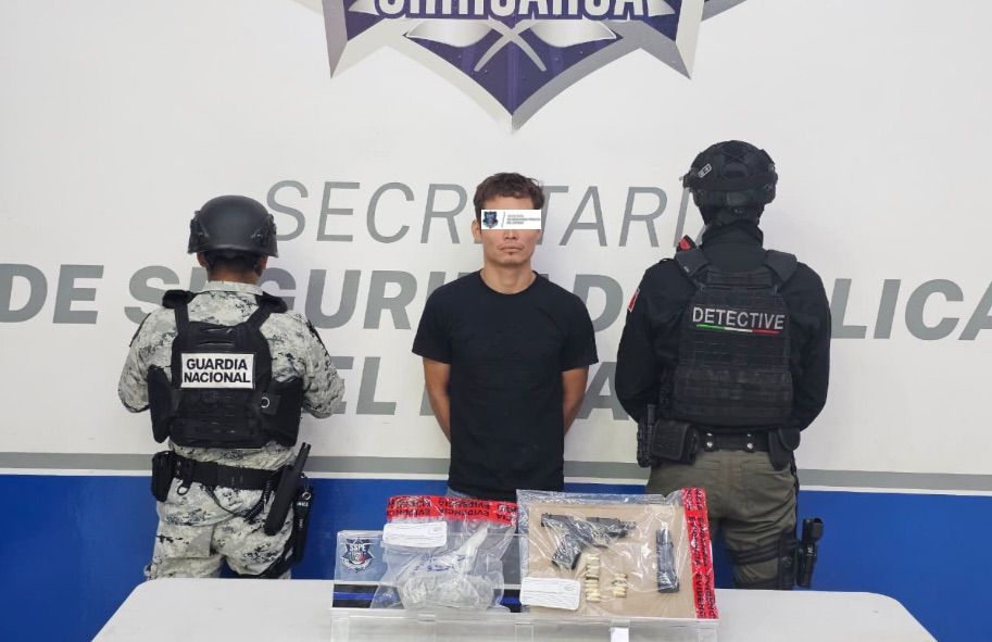 En la colonia Carlos Castillo fue detenido y se le aseguró un arma de fuego calibre 9×19 mm con 15 cartuchos útiles y una bolsa con presunta marihuana.
