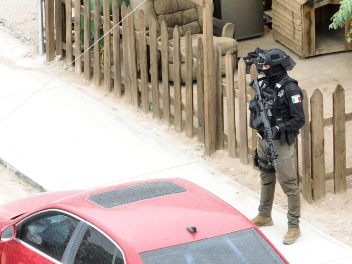 Una vivienda de la colonia Carlos Castillo Peraza fue cateada por autoridades estatales, donde se aseguraron armas de fuego, cartuchos, chalecos con insignias policiales y droga.