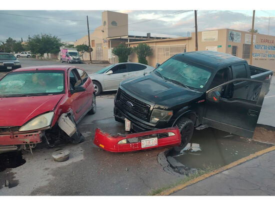Vehículo cae en hundimiento de la avenida Manuel J. Clouthier; por tratar de evitar sufrir igual percance, otros dos automóviles se impactan