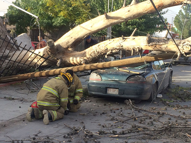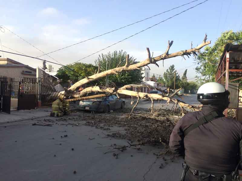 Las ráfagas de viento de más de 60 kilómetros por hora que causó la llegada del frente frío número 10 a la ciudad ya han provocado la caída de bardas, panorámicos y árboles en distintas zonas de Juárez