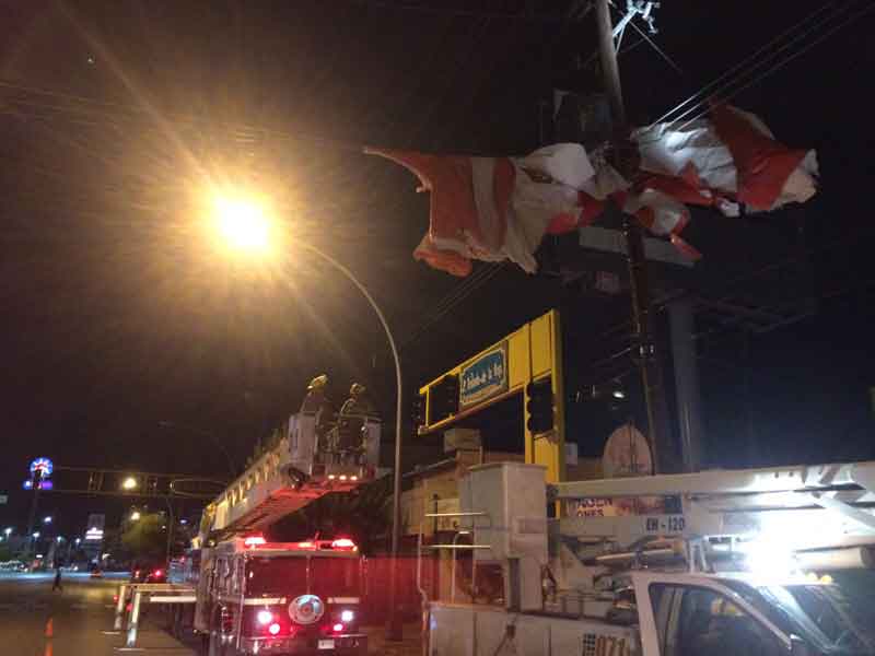 Elementos del cuerpo de Bomberos retiraron una lona que el viento arrastró hasta dejarla enredada en cables de electricidad