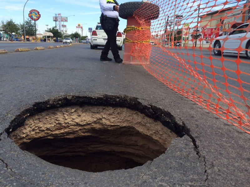 Como consecuencia de las últimas lluvias y la humedad que han provocado en la ciudad, un hundimiento de alrededor de un metro de diámetro se registró en la Gómez Morín y calle Primavera