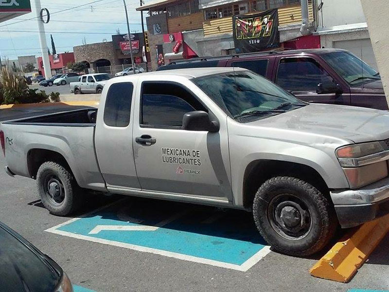 n la imagen se observa una unidad Pick Up color gris de Petróleos Mexicanos que invade el cajón azul, en una gasolinera ubicada frente a plaza Monumental sobre el Paseo Triunfo de la República